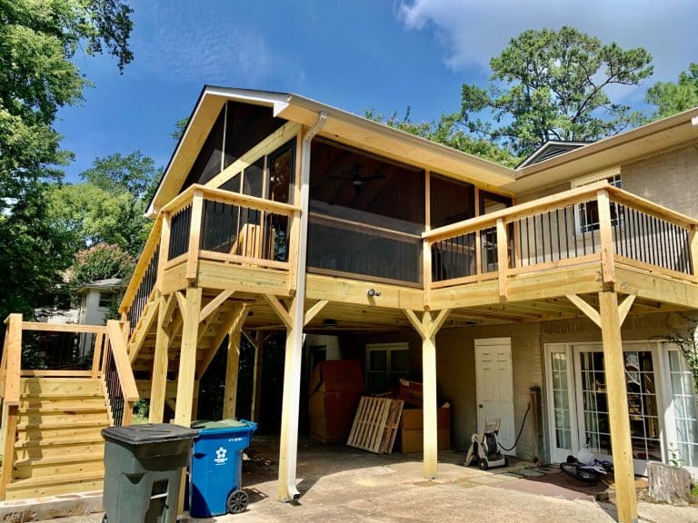 Trex Coastal Bluff and Toasted Sand, Eze-Breeze windows, MiraTEC trim, and a knotty pine tongue and groove ceiling by Alabama Decks & Exteriors Birmingham