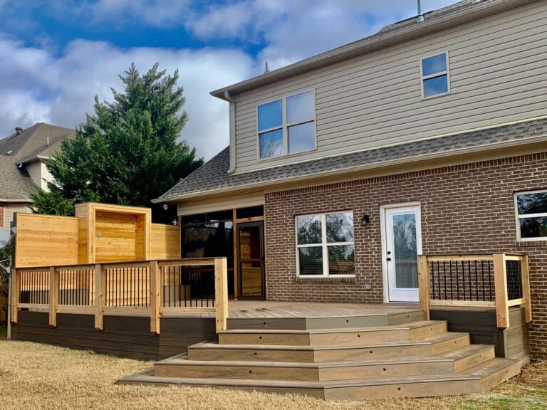 Trex Composite Decking Eze-Breeze Windows Outdoor Gas Fireplace Installation and Design by Alabama Decks & Exteriors Birmingham