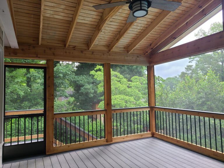 Trex Coastal Bluff and Toasted Sand, Eze-Breeze windows, MiraTEC trim, and a knotty pine tongue and groove ceiling by Alabama Decks & Exteriors Birmingham